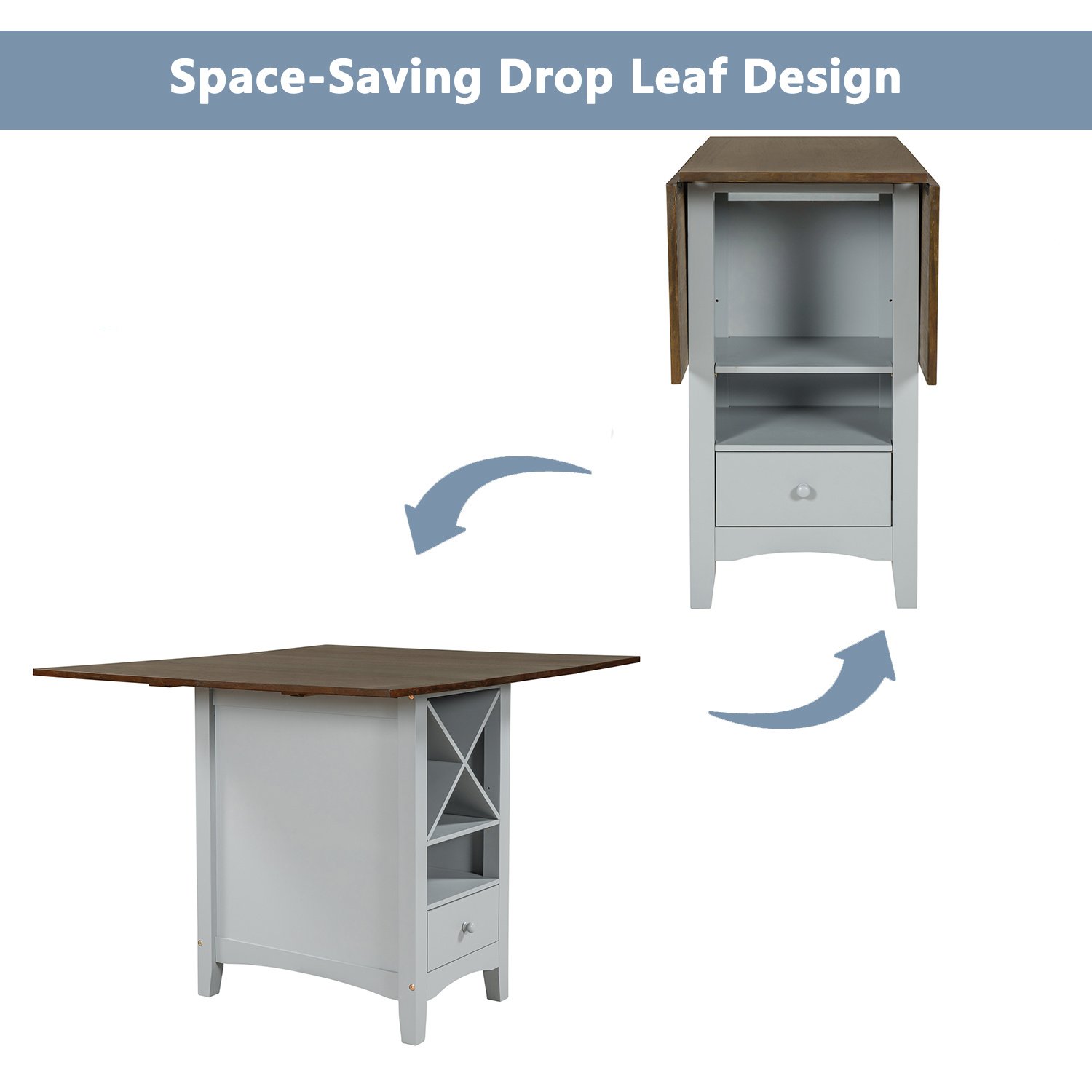 Farmhouse Wood Counter Height 5-Piece Dining Table Set with Drop Leaf; Kitchen Set with Wine Rack and Drawers for Small Places
