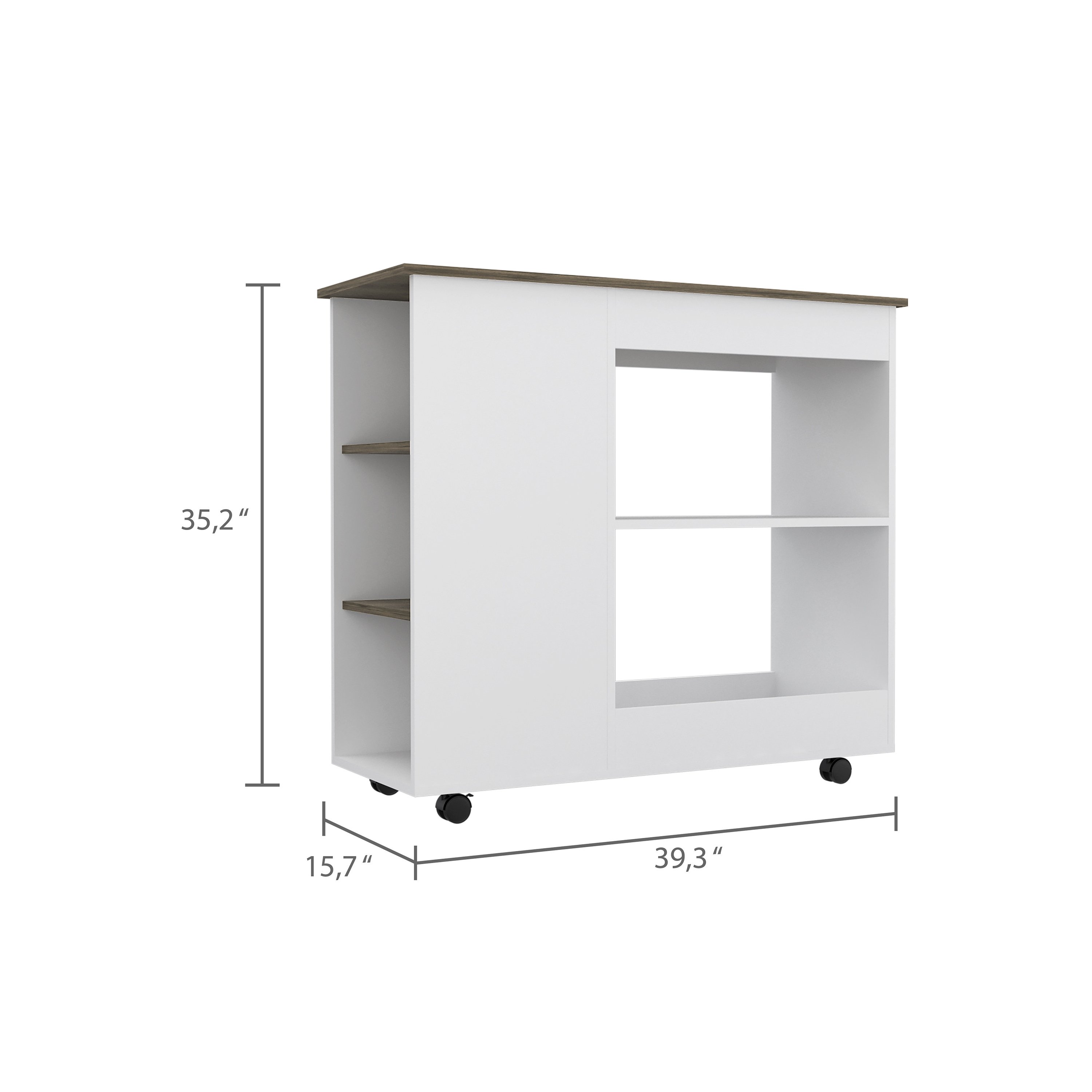 The TUHOME Nigella Kitchen Bar is the perfect way to add extra storage and style to your kitchen. This bar features adjustable caster wheels for easy mobility; perfect for any space. The two large shelves (11; 3'' H x 11; 9'' H X 22; 8'' W X 15.7'' D) provide plenty of room to store your utensils; while the three shelves( 35; 2'' H X 10; 2'' H each one; 13; 7''W) offer a great place to display your favorite decorative items.With elegant White-Dark Brown finish.